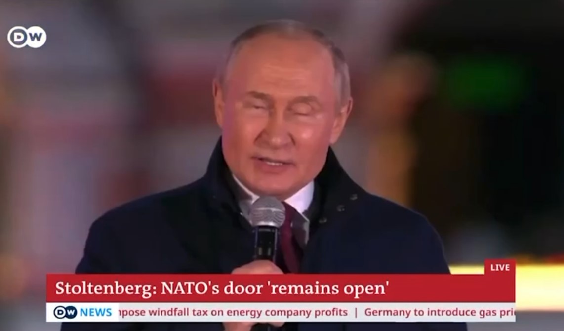 Neznámý hacker se naboural do vysílání Deutsche Welle s generálním tajemníkem NATO Jensem Stoltenbergem a místo toho pustil přenos projevu Vladimira Putina na mítinku-koncertu na Rudém náměstí. (Foto: Youtube / DW)